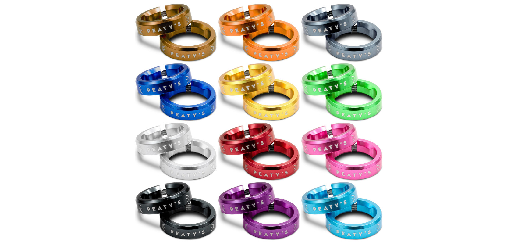 PeatyObejmy chytów Peaty's Monarch Lockrings są wykonane z aluminium 6061, mają smukły zacisk o szerokości 8 mm i są zabezpieczone śrubami ze stali nierdzewnej 3 mm. Mają wytrawione laserowo loga i zorientowane logo Peaty's na końcu chwytu, co pomaga prawidłowo ustawić offset chwytu.